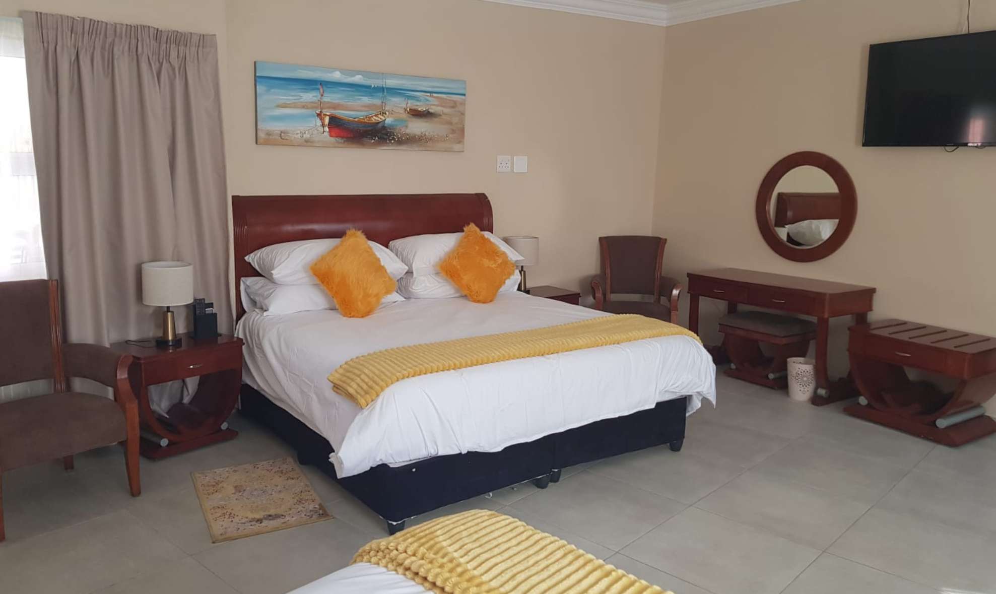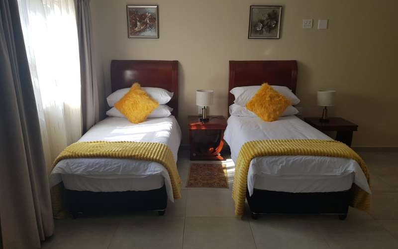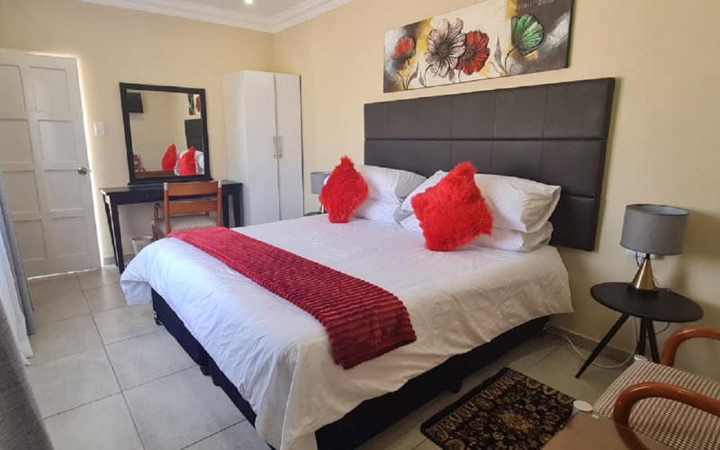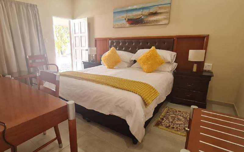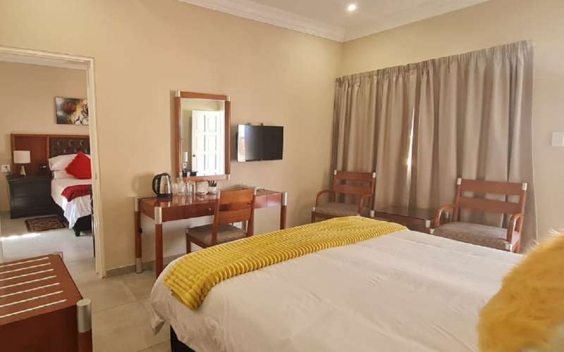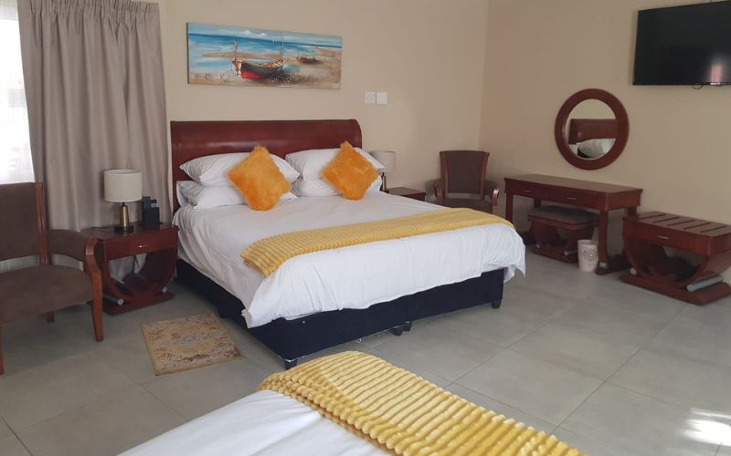 Air-conditioned for comfort, the room is furnished with a king-size bed that can be converted into 2 single beds and has an en-suite bathroom fitted with a shower and a toilet. Room also has a tea and coffee station, TV with DStv and Wi-Fi access.